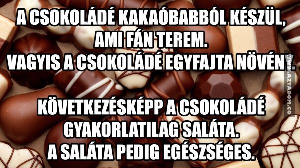 Ezek szerint mindenki nyugodtan ehet csokoládét ugyanis az maga az egészség ;) Nincs olyan édesség amit ne szeretne legalább egy ember ami azt jelenti, hogy az édességeket mindenki szereti. Éppen ezért választottam ezt a témát. Az én kedvenc édességem a Tiramisu és a csokoládé. Szerintem minden embernek kéne a kertjébe egy csokiszökőkút amiből bármikor merhetne egy csésze csokit. A legjobb a világon. Keressetek csoki recepteket!